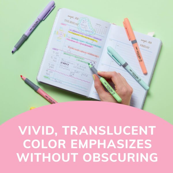 BIC Brite Liner Grip Pastel Highlighters emphasize what’s important on the page without obscuring the text below. Featuring incredibly fun and trendy shades of soft pastel inks, this collection gives you an appealing set of options to emphasize important information in textbooks, notes, documents, journals and more.