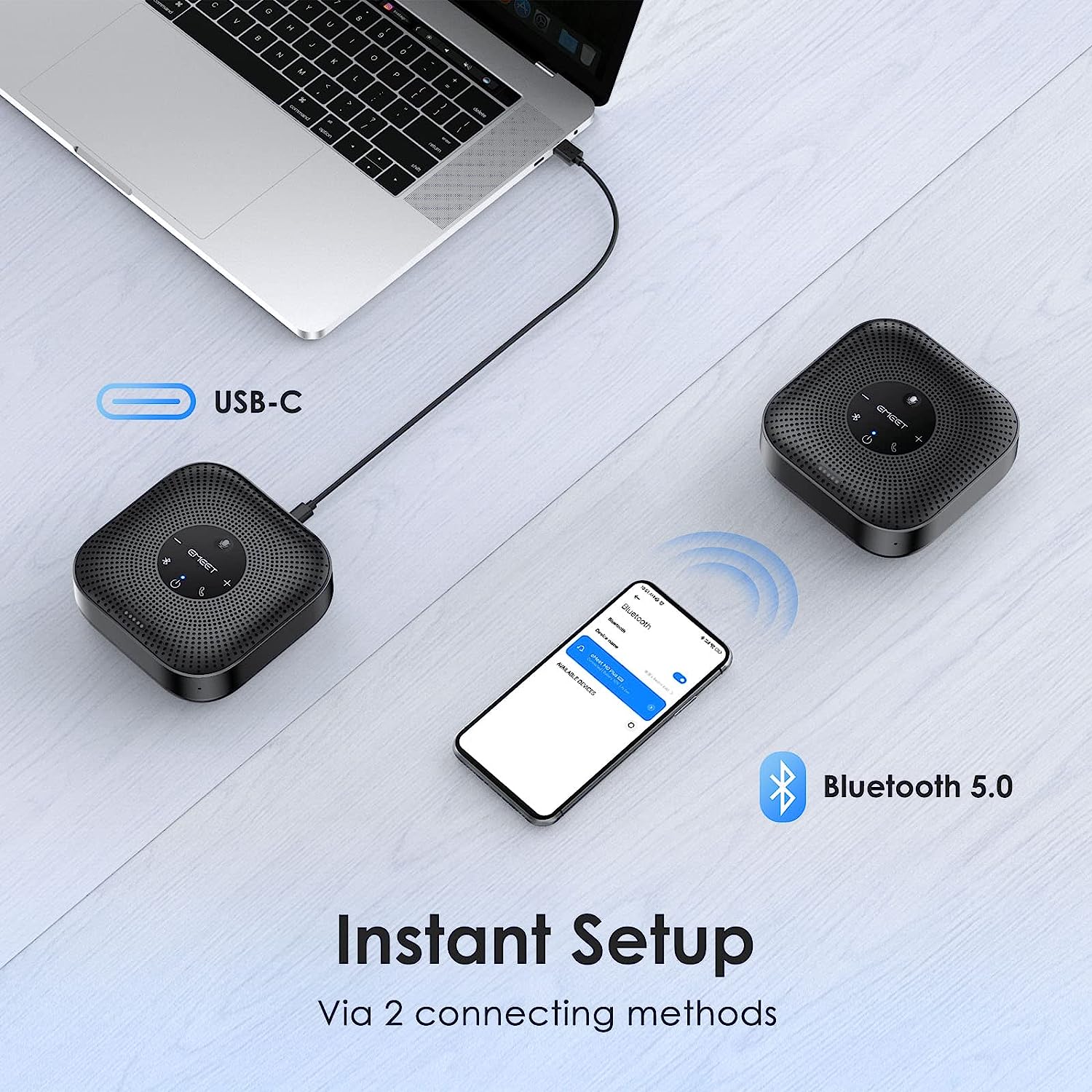 - · [Easy to Set Up and Use] The EMEET Conference Speaker and Microphone M0 Plus offers two ways to connect: USB-C for super stable wired connection, and Bluetooth 5.0 No drivers or additional software is required, simply plug and play. The Bluetooth speakphone is compatible with most conferencing platforms, such as Zoom, Microsoft Teams, Skype for Business, Slack, Webex, and more, so you can start your meeting instantly.