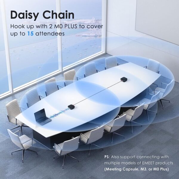 - · [Expandable for Larger Meetings] Room is too large? Link 2 EMEET’s Bluetooth speakerphones with the Daisy Chain, you will have 2x professional mics and speakers working seamlessly extending the conferencing space, effectively supporting up to 16 attendees. This feature supports multiple models of EMEET products, such as Meeting Capsule, M3, or M0 Plus, making it a flexible solution for setting up your conference room.